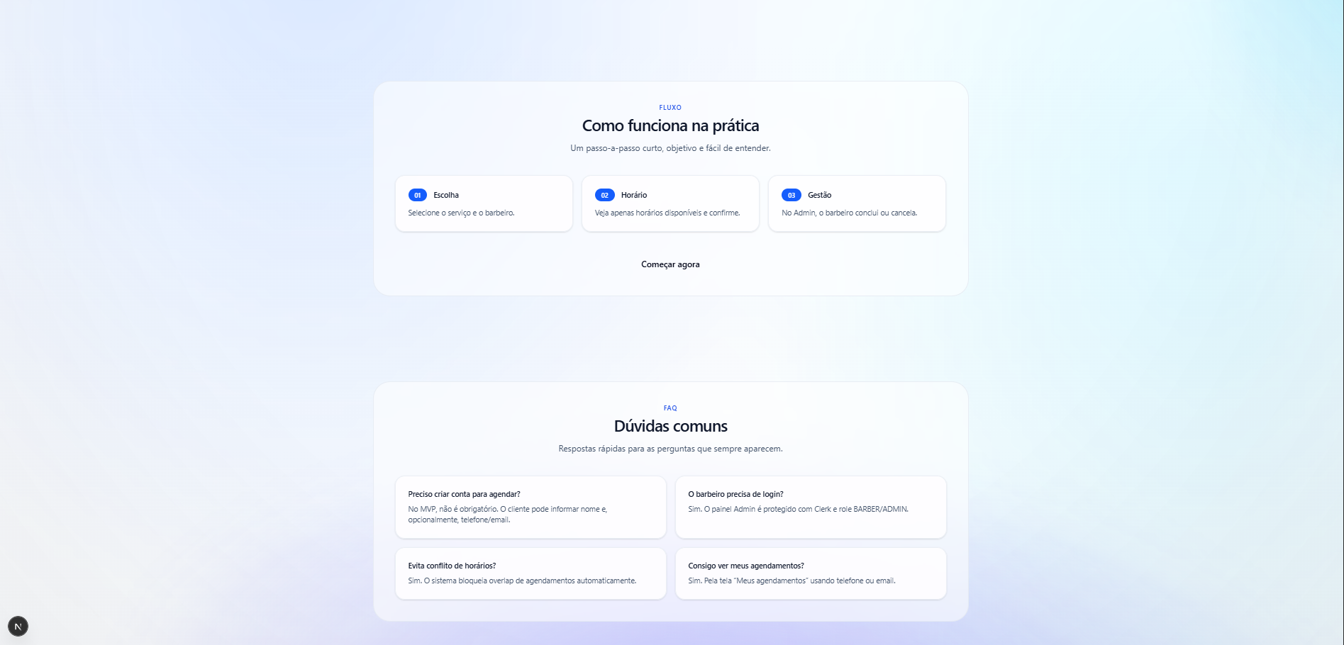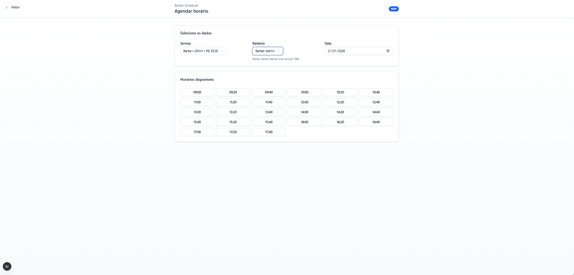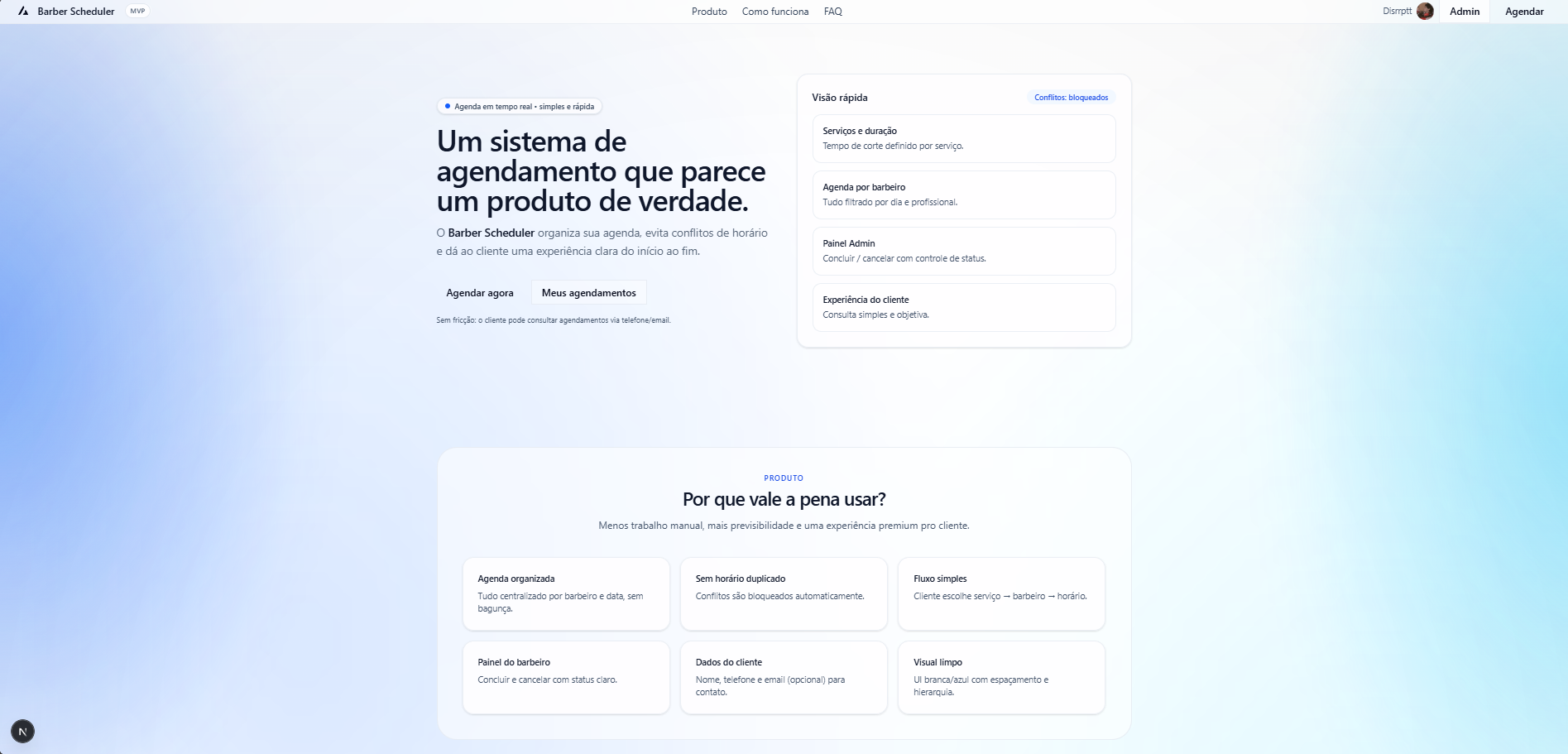 O Barber Scheduler é um sistema de agendamento para barbearias que organiza a agenda por barbeiro, exibe apenas horários disponíveis e bloqueia conflitos automaticamente. Além do fluxo do cliente (serviço → barbeiro → horário), o projeto inclui um painel Admin para o profissional gerenciar a agenda do dia, com ações de concluir/cancelar e status do atendimento.